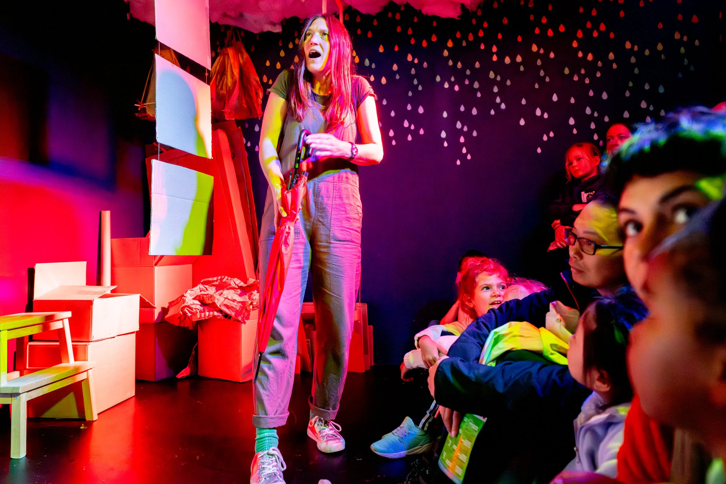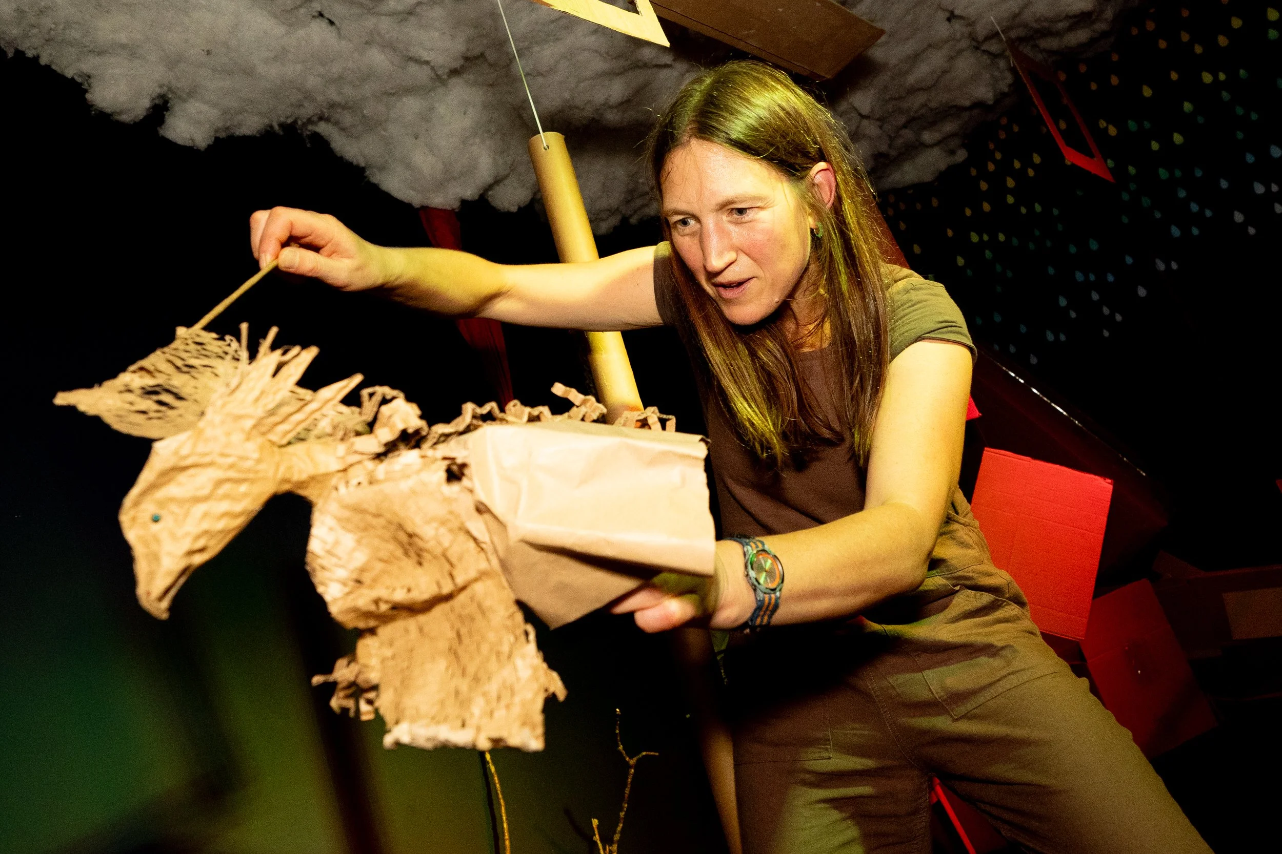 We will work in a physical way to create the world: making a set and props with recycled materials. We will create percussion and a sound-track for scenes.